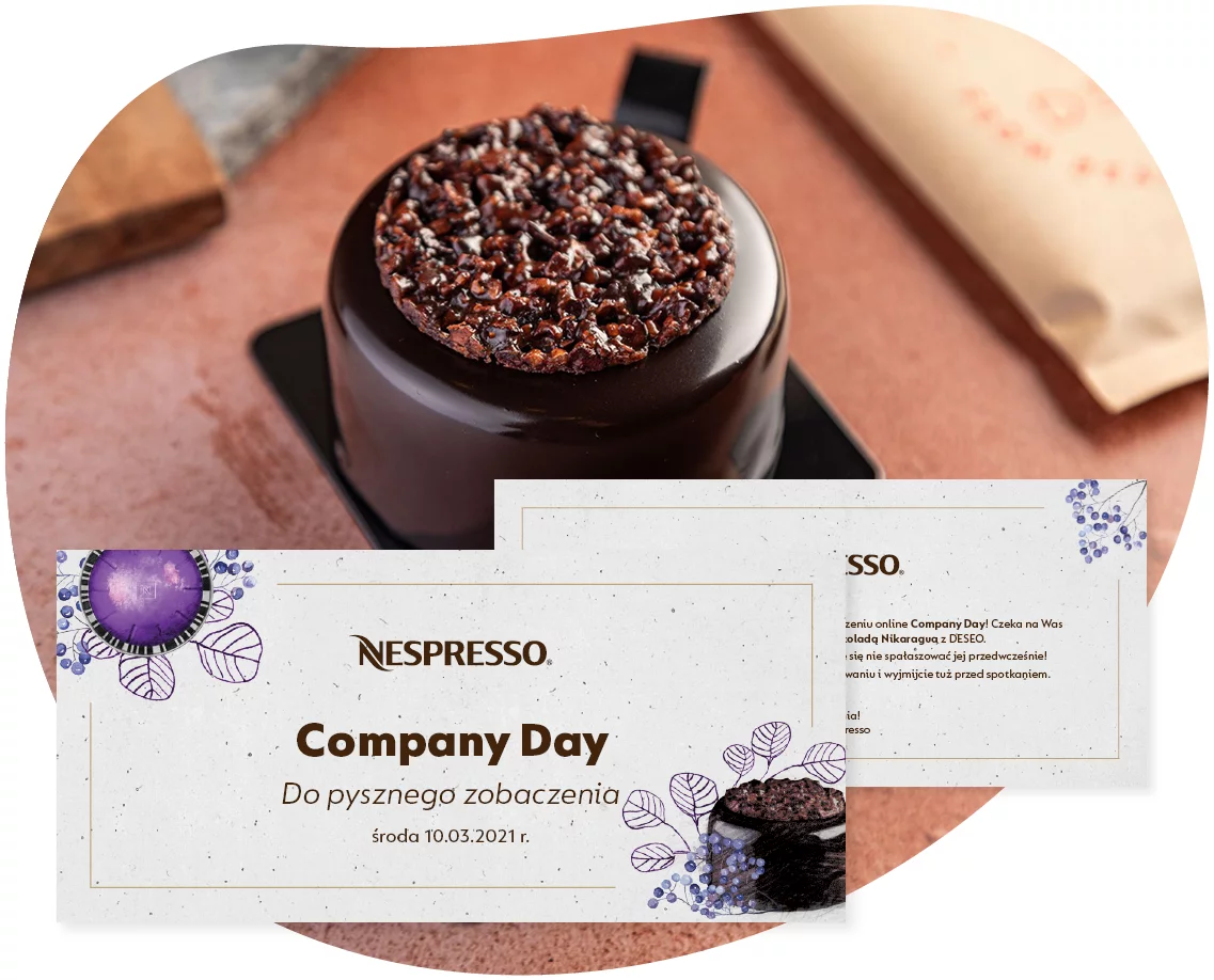W ramach zaproszenia wysłaliśmy pracownikom box startowy z kawą Vertuo, pasującą do niej czekoladą DESEO oraz tematyczny T-shirt, stanowiący dress code spotkania.